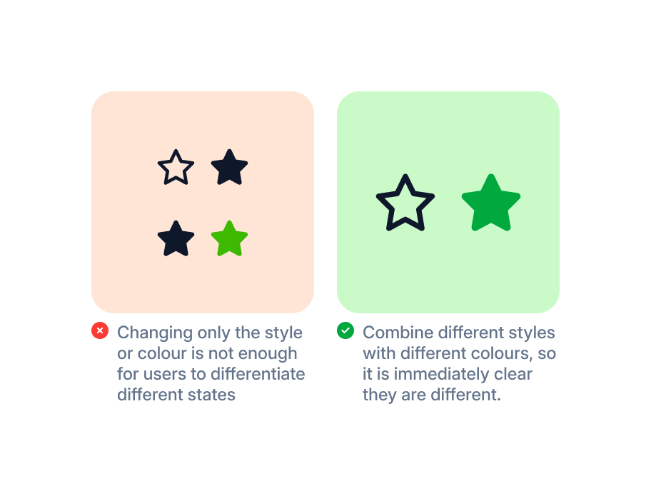When icons are used to represent different states, for example “Add to watchlist” and “Added to Watchlist” -- use a different style and colour for the other state.   This makes it instantly clear and obvious that the icon is different.