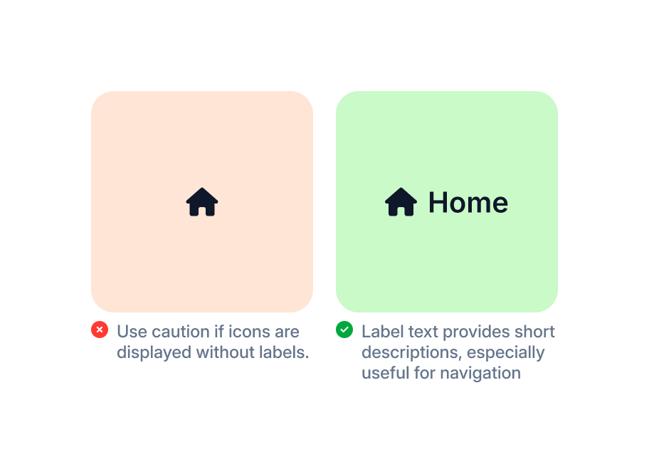 Label text provides short, meaningful descriptions when symbols are more abstract. This can prove helpful in the case of navigation. Icon meaning should always be unambiguous and accessible for all users. Text labels can be omitted in specific circumstances where reduced visual impact is necessary.