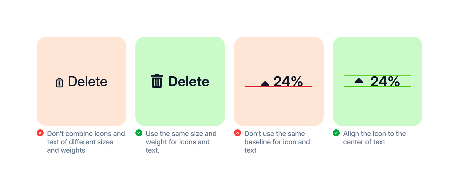 In some cases, standalone icons might not clearly convey what they mean, which is why we should always consider combining icons with text to ensure users understand our product. Please adhere by the following rules when combining icons with text: